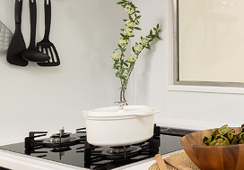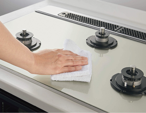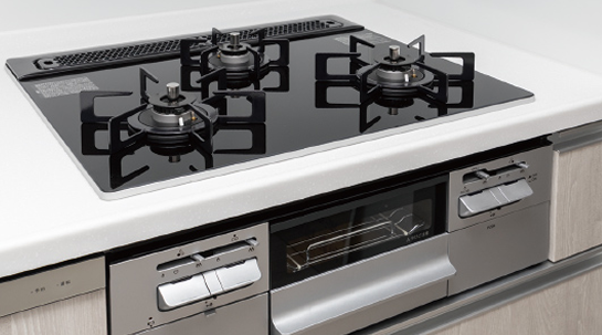 省エネ性とすっきりとした天板デザインで、使いやすいガラストップコンロ。オートグリル機能や、すべてのバーナーに安心センサー搭載。他にも鍋底の焦げはじめを感知し、自動的に消火など多彩な機能が備わっています。