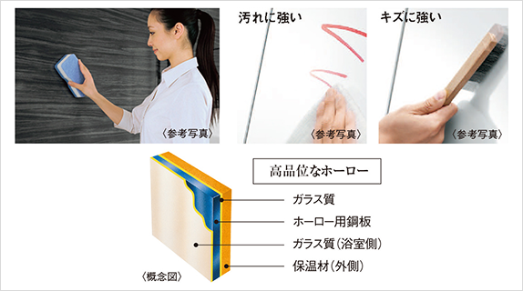 表面がガラス質なので、カビを寄せ付けません。湯アカも水拭きでサッと拭くだけでキレイに落とせます。