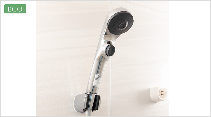 快適さを損なわずに節水。シャワーヘッドのボタンを押すだけで止水が出来る節水仕様のシャワーヘッドを採用しました。