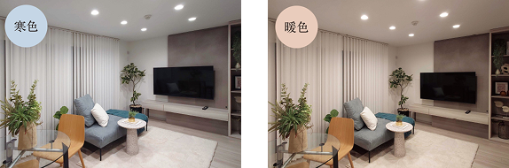 リビング・ダイニングの照明は寒色と暖色に調整可能。シーンによって使い分ができます。