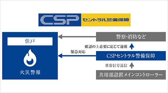 風除室、エレベーター前、住戸玄関前で安全を確認する2重のセキュリティを構築。マンション内への不審者・不要者の侵入を抑制します。またマンションでの火災を感知した場合、警備担当者が出動し一時対応します。