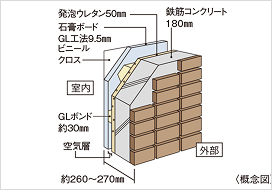 外壁には、耐熱性を高めるGL工法を施しています。躯体コンクリートの内側に50mmの発泡ウレタンを吹き付け、空気層を形成。さらにその内側にGL工法により内側基材の石膏ボードを張り付け、外壁全体を発泡ウレタンと空気層で包み込むことにより、高い断熱効果が得られます。