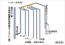 各住戸の給水・給湯管には保温材付ポリブテン管を使用したヘッダー方式を採用。また、給水たて管には耐久性・耐震性に優れた水道用耐震型高性能ポリエチレン管を使用しています。