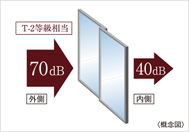 外部騒音を軽減するために、全住戸の窓に遮音等級T-2相当を採用しました。