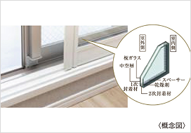 二重サッシを設けて断熱性、遮音性に配慮しています。二重サッシ内側にある樹脂サッシは複層ガラスを採用し、断熱性に優れ結露の発生も抑えます。