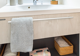 洗面ボウルの手前にタオル掛けを設け、手洗い・洗顔時など、すぐに手に取れる便利な仕様です。