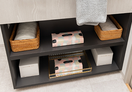 ミラーの内側すべてが収納スペース。高さ調整ができる可動式トレーでスペースを有効に活用できます。
