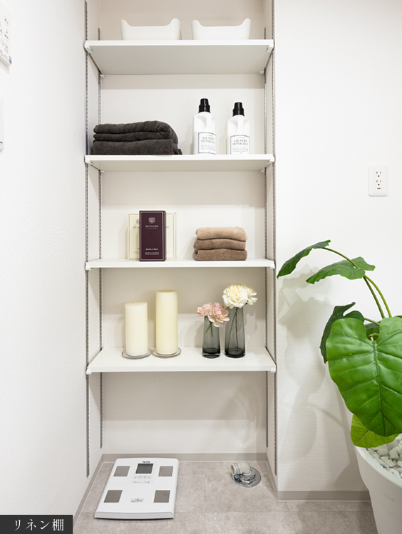 石鹸やシャンプー、タオル類をたっぷり収納。ユーティリティをすっきりとした空間に保てます。